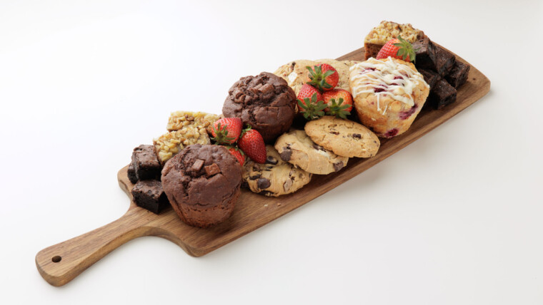 Banana bread, chocolate brownie, muffin, cookies & strawberries