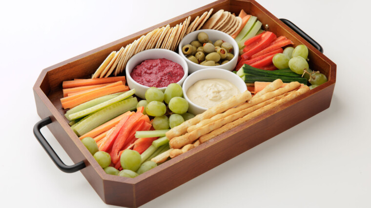 Mix of fresh vegetable sticks, crackers, olives with 2 dipping sauce